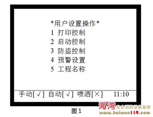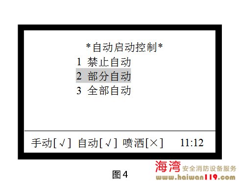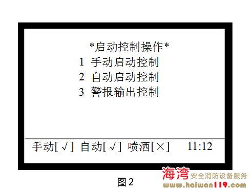 啟動控制設置 在圖1所示界面下,按2進入“啟動控制”界面,調出啟動控制操作菜單,如圖2所示,包含手動啟動控制、自動啟動控制、警報輸出控制的設置,可通過按下其對應的數(shù)字鍵進行相關的設置