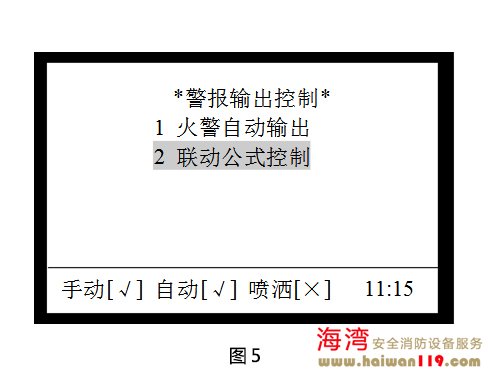 “警報輸出控制”是指對控制器的警報輸出接口進行設置,可以設置為火警自動輸出及聯(lián)動公式控制方式。